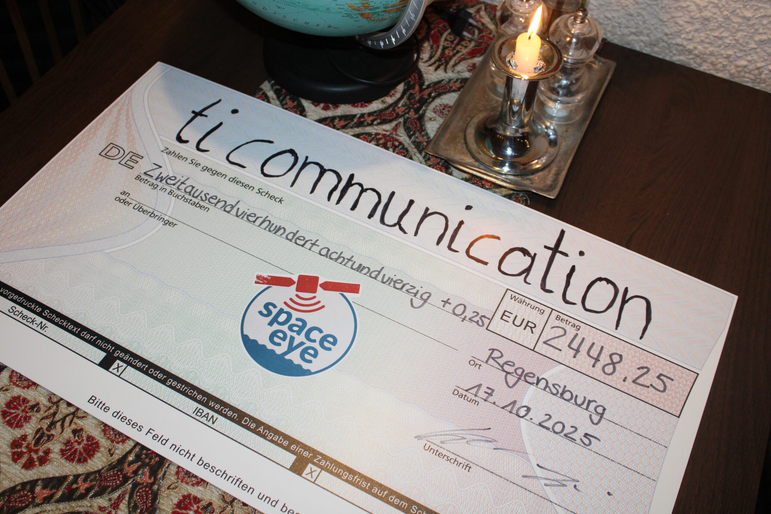 The entire proceeds of €2,448.25 were donated to Space-Eye e.V., a Regensburg-based organization that works tirelessly for humanity, solidarity, and aid in times of need.